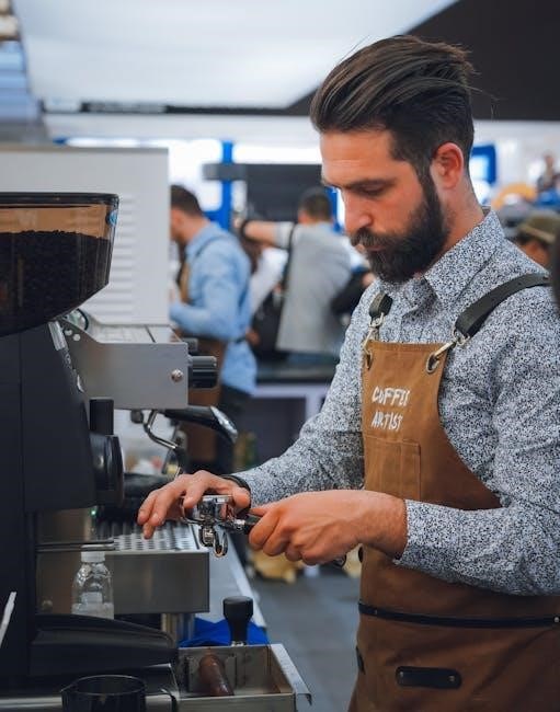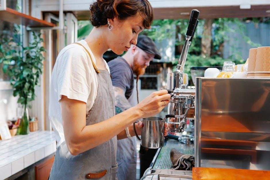 Regular maintenance ensures optimal performance. Clean the machine daily, descale every 3 months, and check for worn parts. Proper upkeep extends longevity and maintains flavor quality.